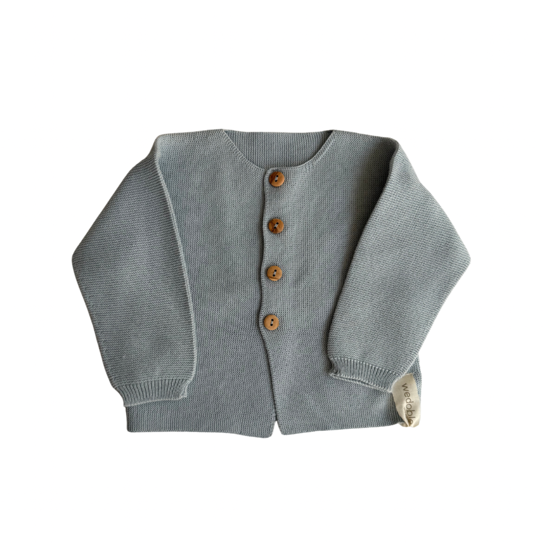 Cárdigan de manga larga tejido en fina malla de algodón orgánico, suave y transpirable, ideal para bebés niños y niñas de hasta 2 años. El cárdigan se abrocha en la parte delantera con botones de madera. Producido en una sola pieza sin costuras, para el máximo confort de tu bebé.