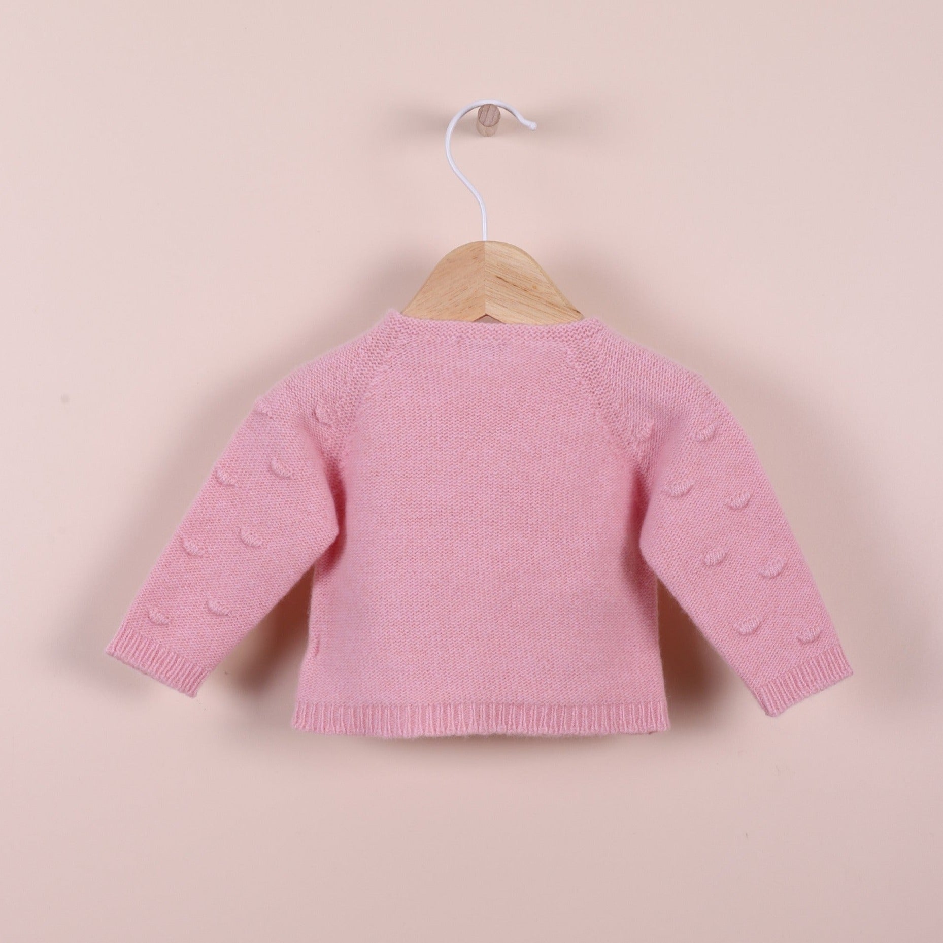 Cárdigan tejido en suave mezcla de lana merino y cashmere, ideal para bebés niños y niñas de hasta 4 años. El cárdigan de manga larga HAPPY TIME IN WINTER tiene detalles de punto de pompones que realzan la belleza y el carácter único de la prenda, tiene dos bolsillos y se cierra en la parte delantera con botones de madera.