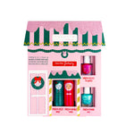 Casita de Navidad Charlotte con dos bálsamos labiales aroma cereza (color verde) y mango (color rojo) y dos esmaltes de uñas a base de agua aroma manzana (color turquesa) y aroma fresa (color fucsia).
