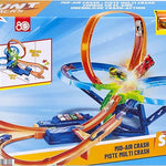 El conjunto de pista acrobática Choque en el aire de Hot Wheels incluye las carreras, acrobacias y choques favoritos de los niños y niñas con un propulsor motorizado y un coche de Hot Wheels.