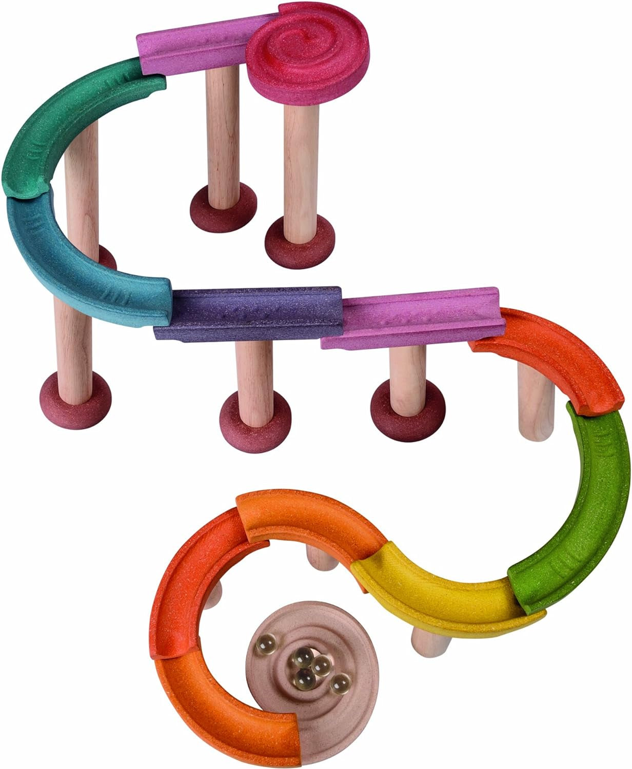Set de 30 piezas de madera para crear un divertido circuito de bolas, Marble Run Deluxe de PlanToys.