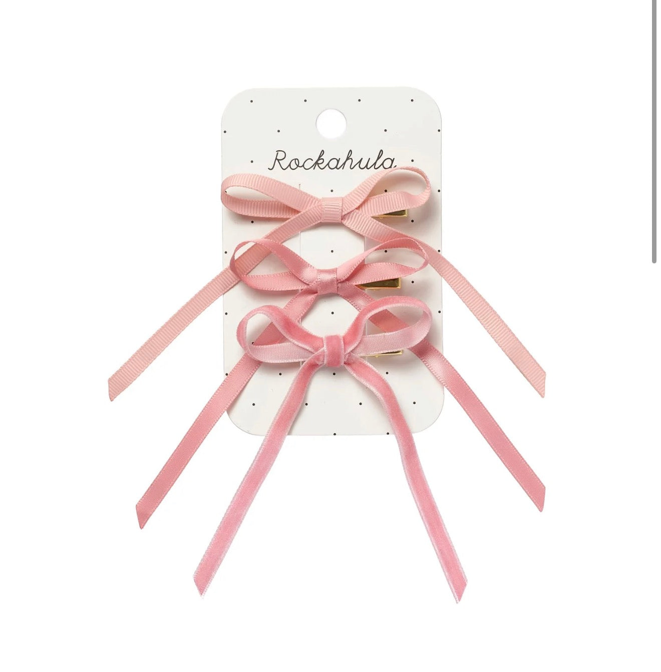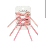 ¡Combina y juega con este encantador pack de tres clips para conseguir el look más dulce! Tres pequeños lazos de cinta anudados a mano en una delicada paleta de rosas suaves, montados sobre clips dorados tipo pinza. Puedes llevarlos uno, dos… ¡o los tres a la vez!