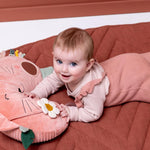 ¡Vamos a ponernos cómodos! Este mullido y alegre cojín para estar boca abajo ayuda a tu peque a fortalecer el cuello y la espalda a la vez que estimula sus sentidos con diversión para mantener su interés. Encontrará un espejo brillante (con una hoja para jugar al escondite), cuentas que hacen ruido, un cascabel y tentadoras texturas para explorar, todo ello para estimular sus sentidos y fomentar las habilidades motoras mientras su cuerpo crece.