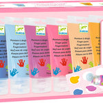 Contenido: 6 tubos grandes de pinturas de dedos (6 x 75 ml): azul, azul claro, morado, rosa, beige, amarillo y 1 paleta.