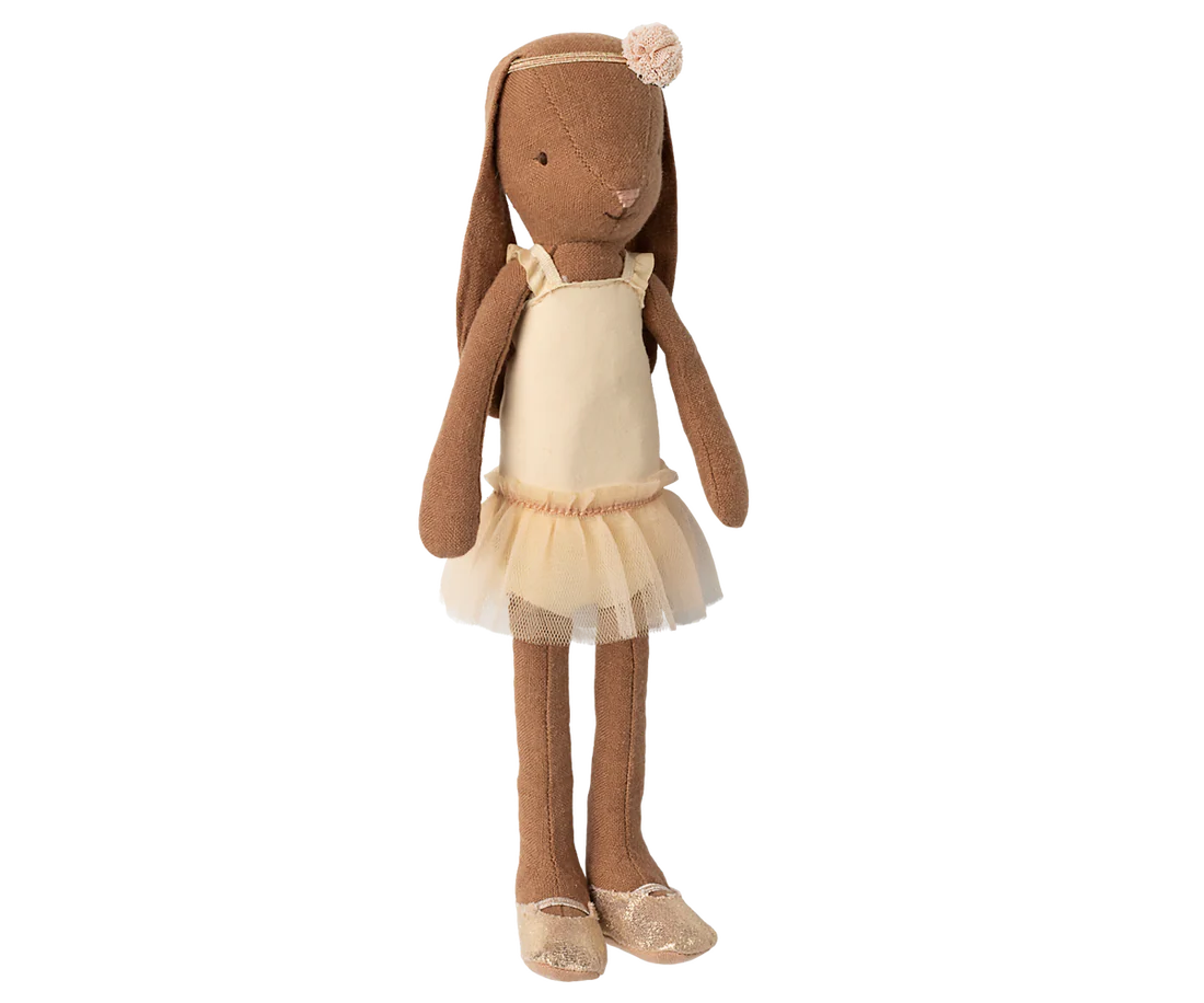 El conocido conejito Maileg disfrazado de bailarín de ballet. Lleva un traje color crema, falda de tul y zapatillas de ballet.