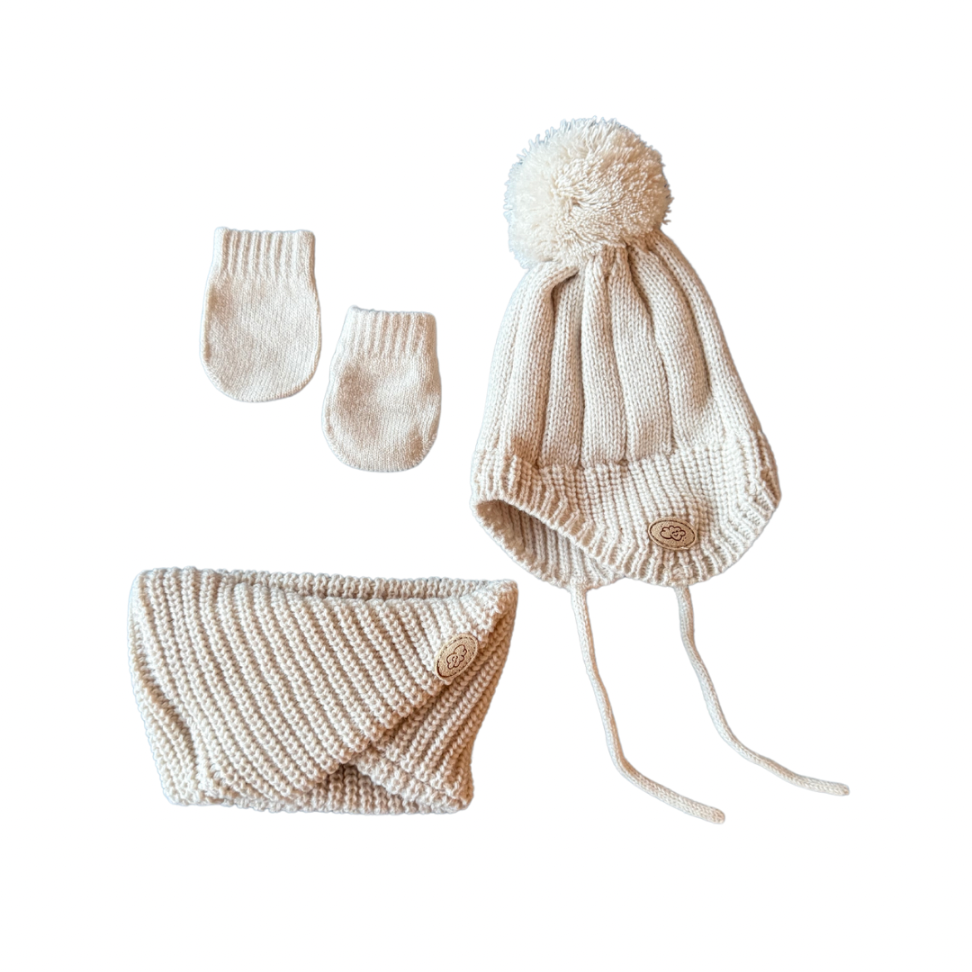 Conj. 3 pzas.: Gorro, cuello cruzado y manoplas.
