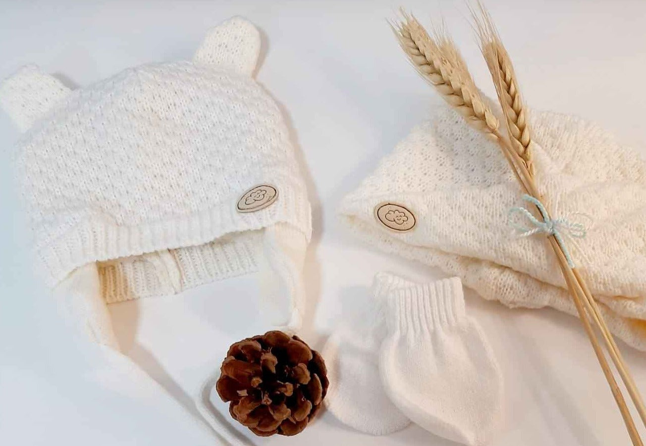 Conjunto 3 piezas formado por gorro, cuello recto y manoplas. Punto abultado, gorro con detalle de orejitas y forrado de coralina. Cuello cruzado.