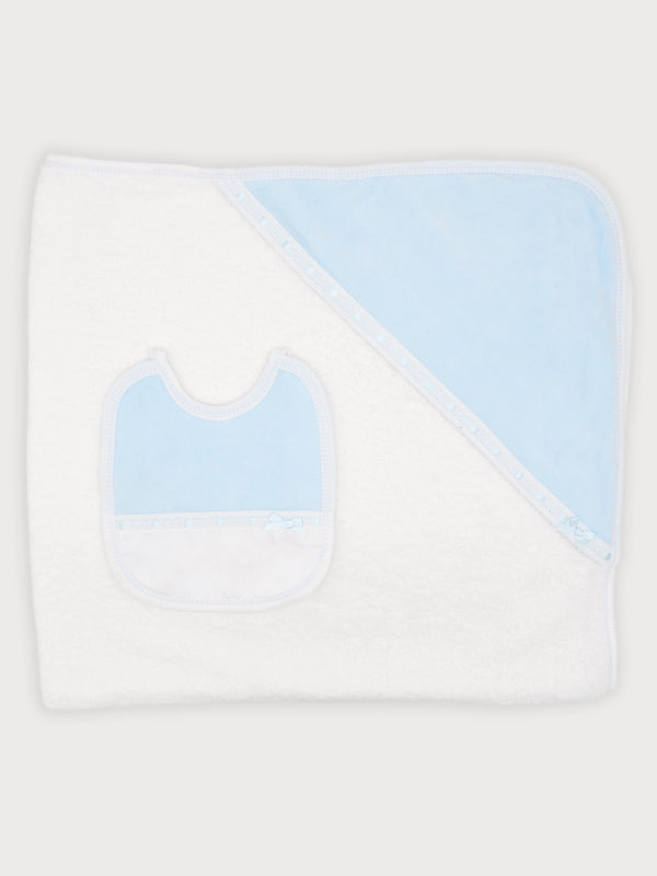 Capa de baño de 100 x 100 cm con detalle azul en la capucha y babero a juego.