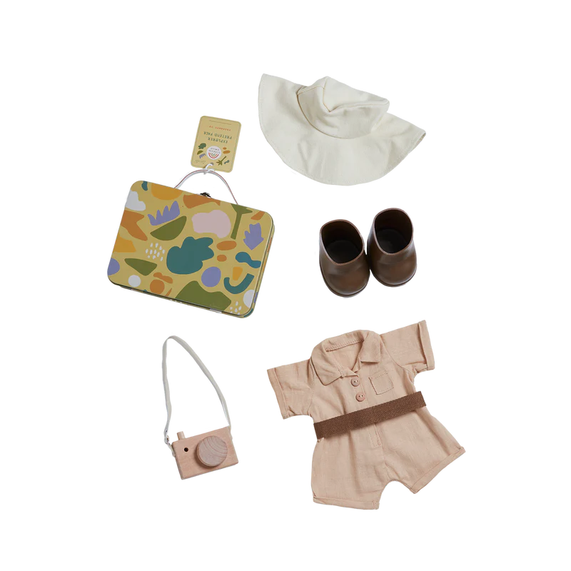 ¡Con este kit de explorador de la jungla, Dinkum Dolls estará listo para embarcarse en aventuras en abundancia! ¡Recorre el mundo con un mono 100% algodón con un práctico cinturón a juego, un sombrero de safari y botas sin cordones!