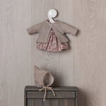 Conjunto para muñecos de 28cm con vestido flores y trenca de punto .