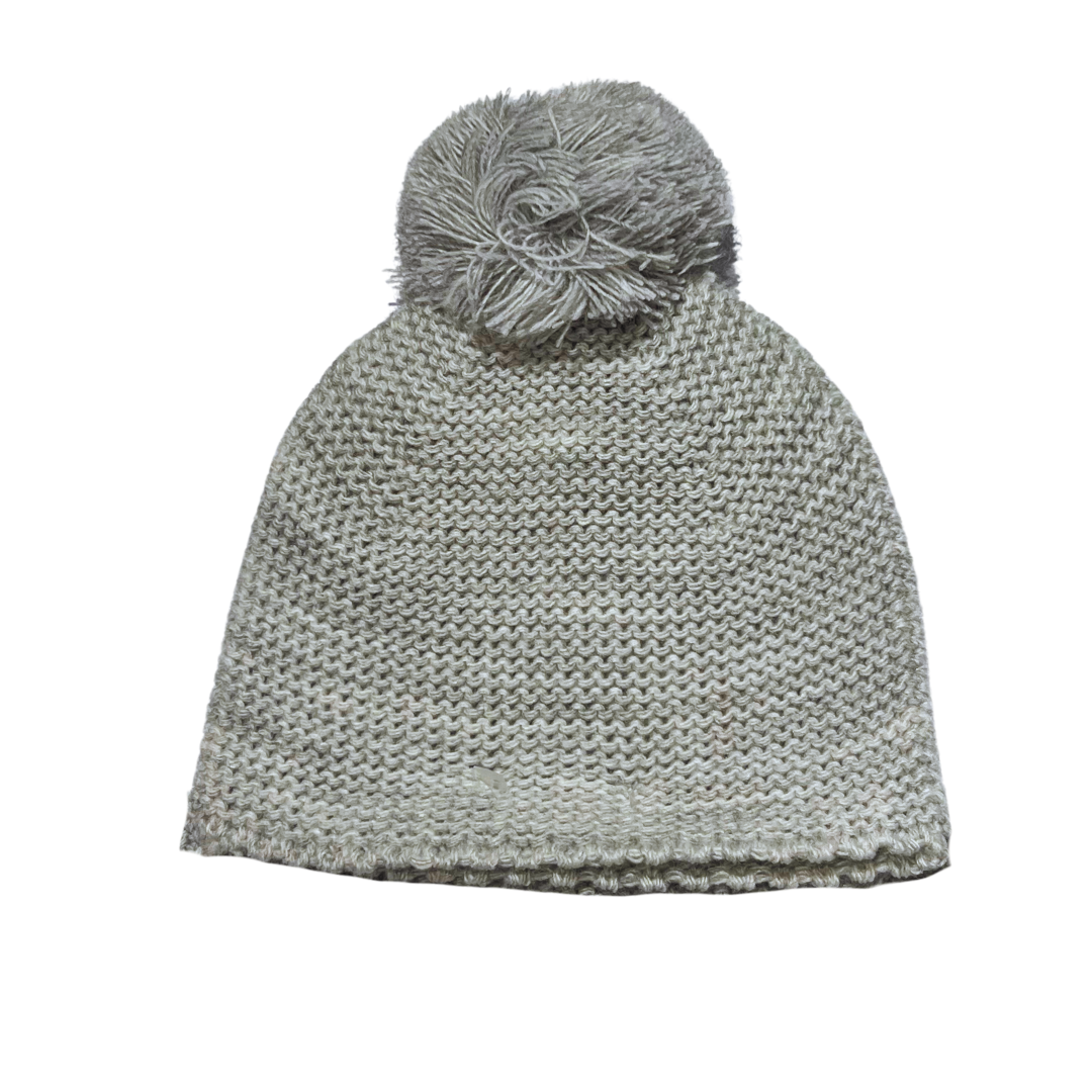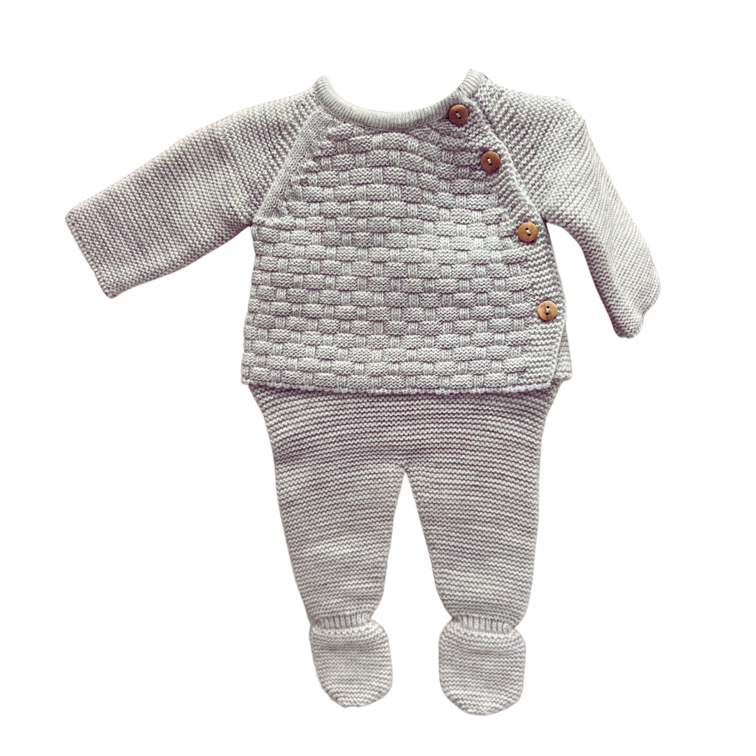 Conjunto de tres piezas compuesto por un jersey de punto con botones de madera laterales, polainas y gorrito con pompón. Todo de punto.