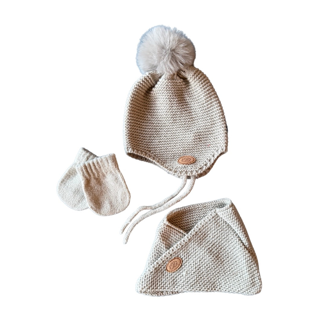 Conj. 3 pzas.: Gorro, cuello cruzado y manoplas.