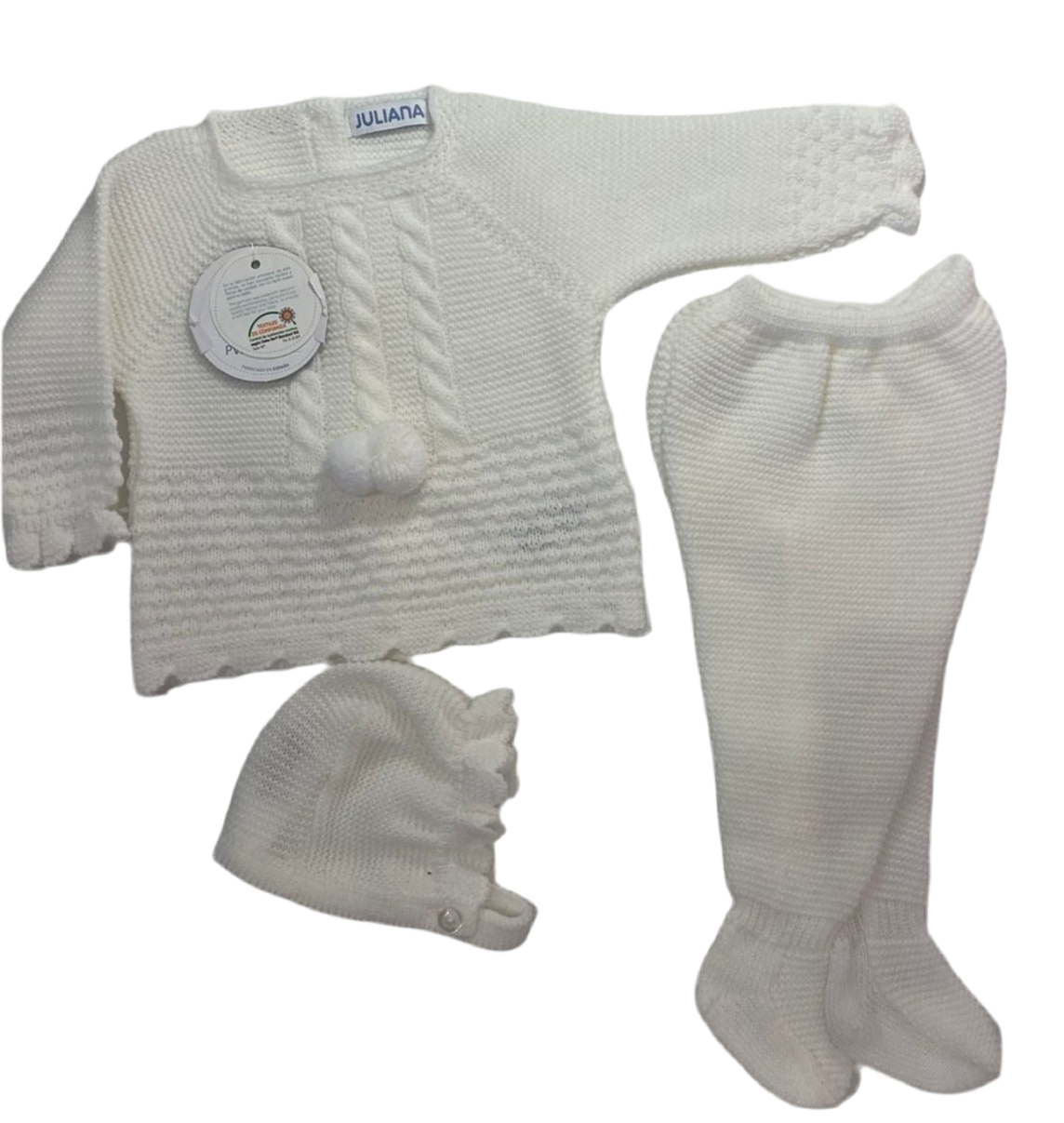 Precioso y dulce conjunto para recién nacido. Conjunto compuesto por 3 piezas. Conjunto de punto perlé. Jersey de manga larga con detalles trenzados en la parte delantera, pompones como decoración. Polaina y capota a juego.