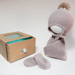 Conjunto de primera puesta compuesto de gorro, cuello cruzado y manoplas.