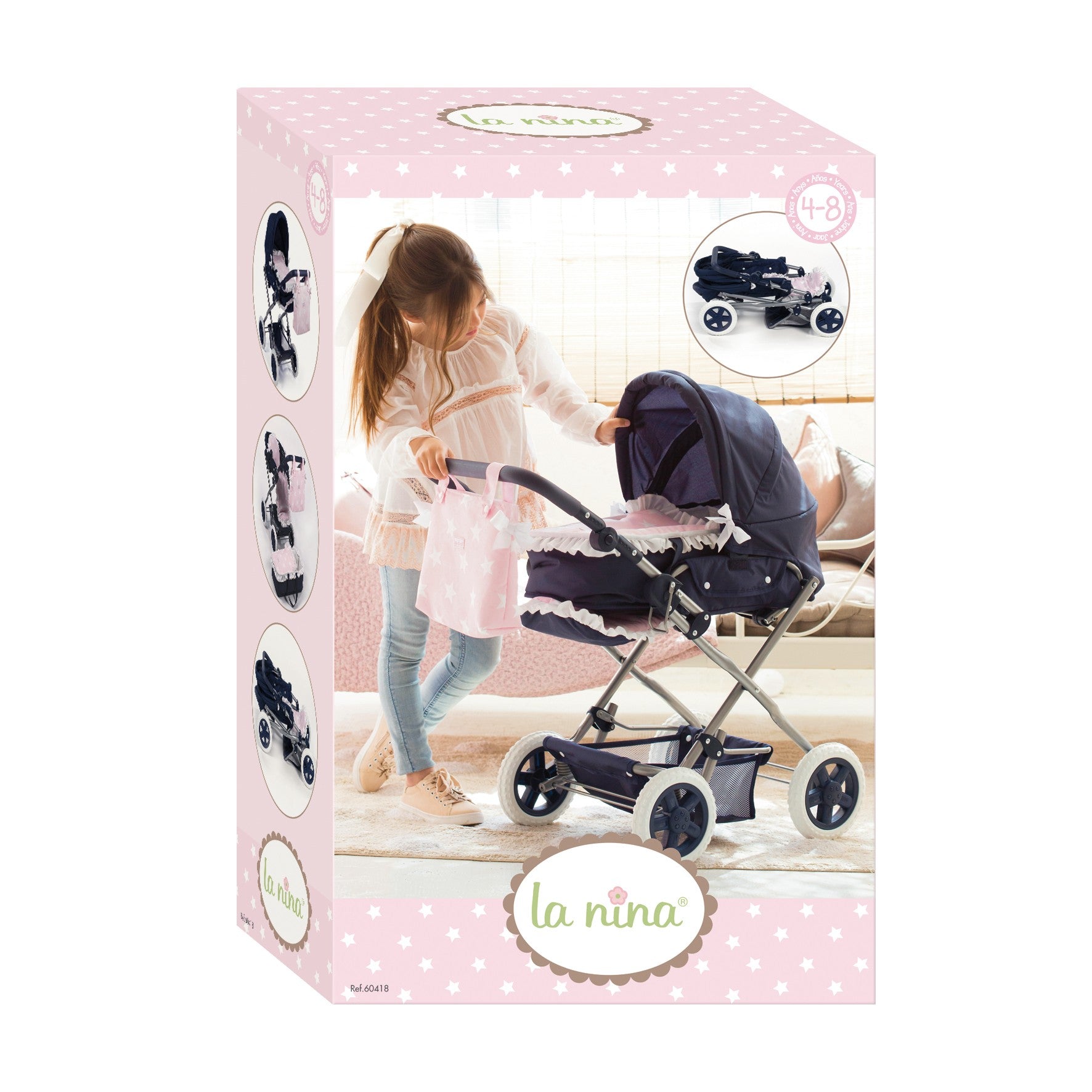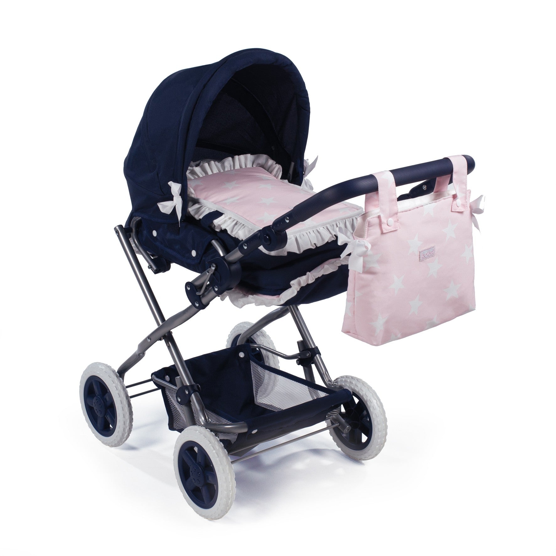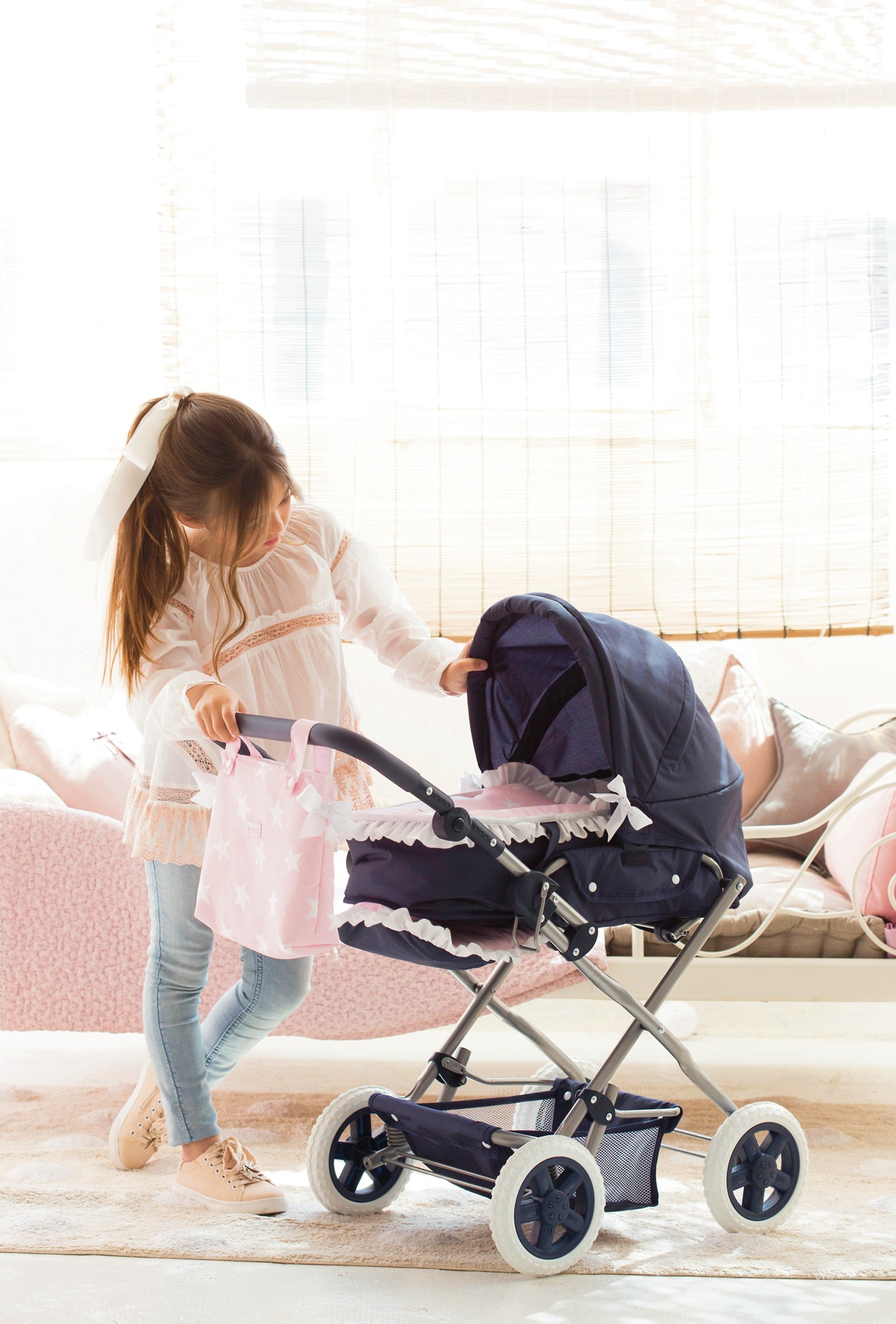 Cochecito para muñecas Carlota que puede ser cuco o sillita, con mango regulable para adaptar el cochecito mientras creces, puedes usarlo de los 4 a los 8 años. Ideal para muñecas de 36 a 52 cm. Combina tela azul marino con estrellas rosa. Incluye bolsa canastilla para llevar todos los accesorios de las muñecas así como cesto de la compra. Plegable, ocupa poco espacio, fácil montaje. Acabados de calidad, solida y estable. Juguete de imitación.