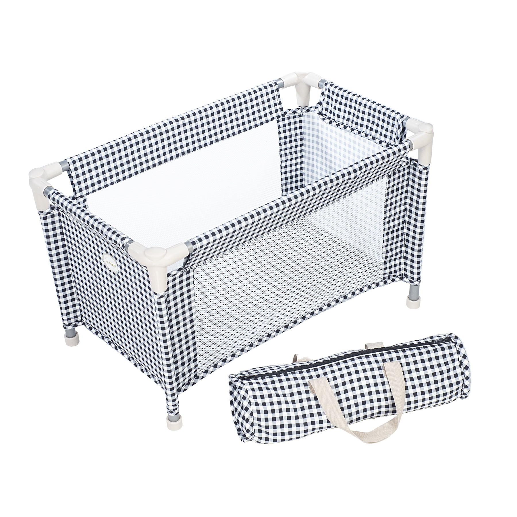 Práctica cuna de viaje con estampado vichy. Es de fácil montaje para que los peques se la lleven a todas partes. Incluye bolsa para guardarla y para su fácil transporte. El muñeco que puede ponerse en la cuna puede medir entre 30 y 52 cm. Puede lavarse a máquina. Se recomienda para niños a partir de 2 años.