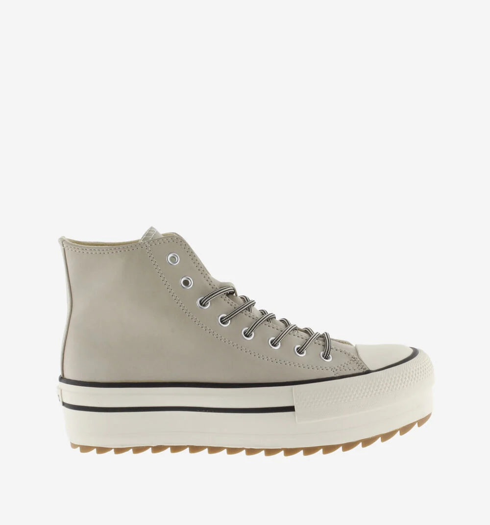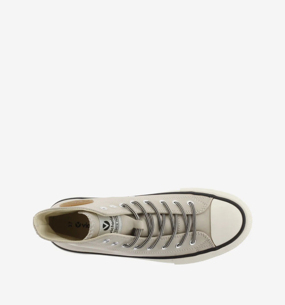 Zapatillas de caña alta beige para mujer fabricadas en material efecto piel. Parche marrón de Victoria en relieve en el lateral interior y etiqueta en la lengüeta. Cierre mediante cordones redondos al tono. Con plataforma de 4 centímetros para aportar más altura. Suela dentada y refuerzo en la puntera que las hace más resistentes y duraderas.