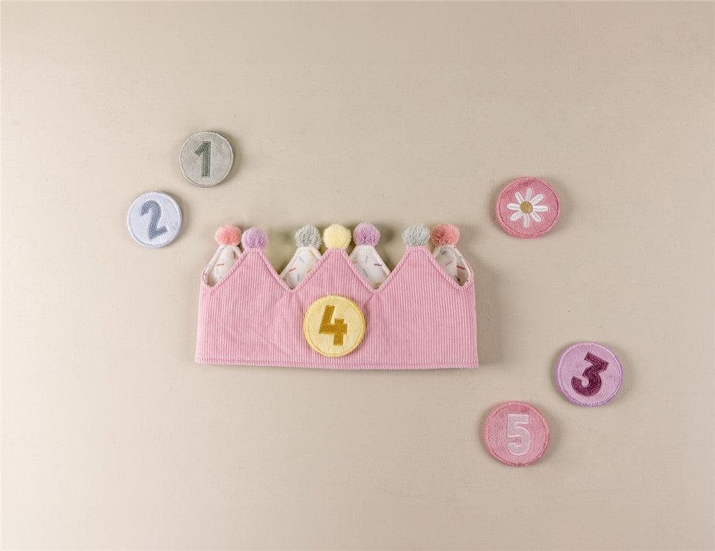 La corona está confeccionada en suave tejido acolchado y acanalado en color rosa claro rematada con pompones de colores. El cierre de velcro permite que la corona se adapte y crezca con su hijo. Observe a su pequeño usar la corona con orgullo, mostrando su edad con cada sonrisa y risita. ¡Feliz celebración!