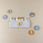 La corona está confeccionada en suave tejido acolchado y acanalado en color azul claro rematada con pompones de colores. El cierre de velcro permite que la corona se adapte y crezca con su hijo. Observe a su pequeño usar la corona con orgullo, mostrando su edad con cada sonrisa y risita. ¡Feliz celebración!