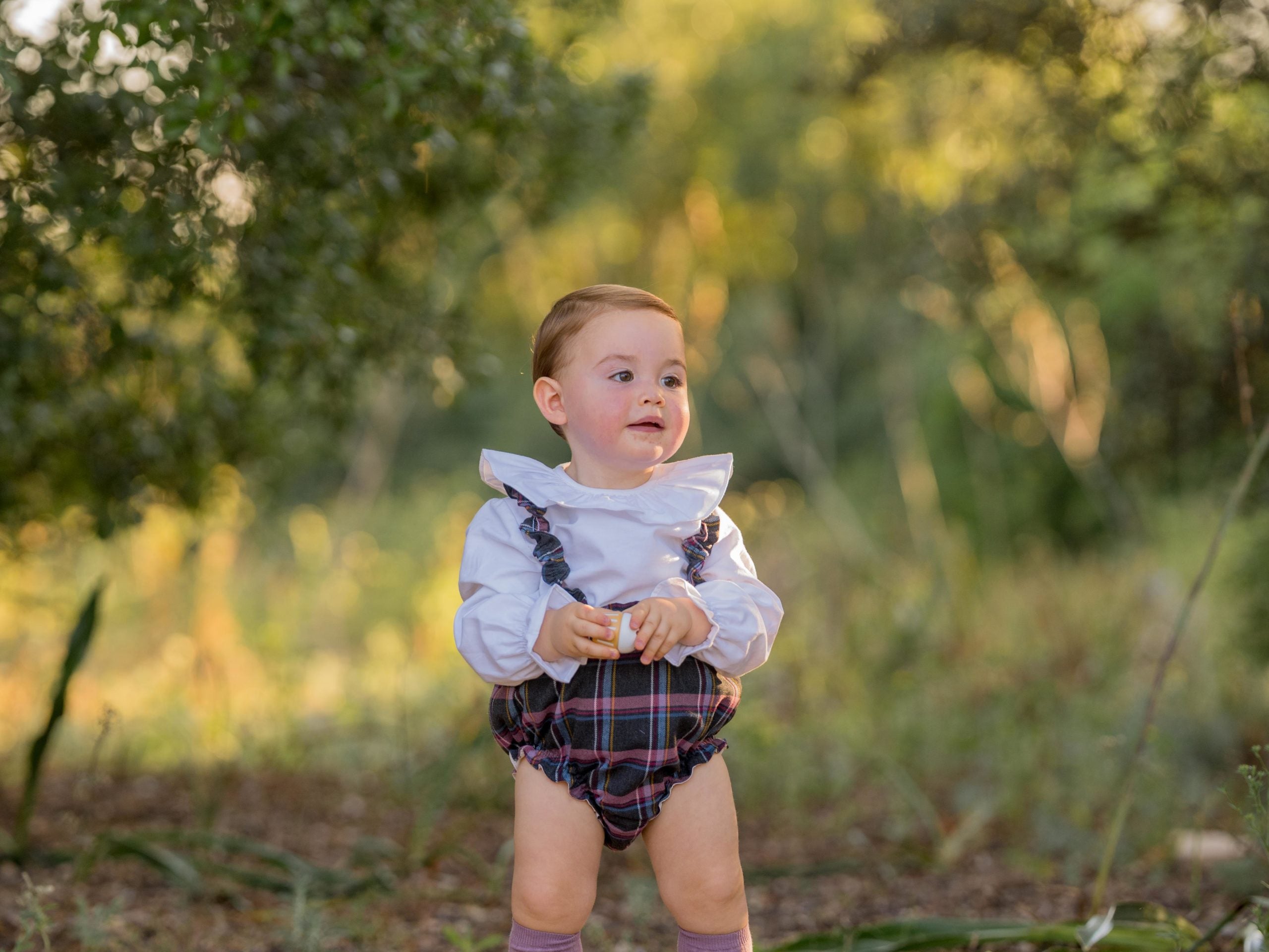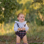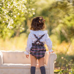 Culetín tirantes extraíbles con botones en tejido tartán con tonos azules, rosa y toque mostaza.