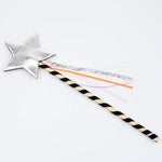 Una estrella de cuero de textura plateada cubre la varita y tiene cintas plateadas Ric RAC, menta, lila, rosa polvoriento y naranja colgando de ella