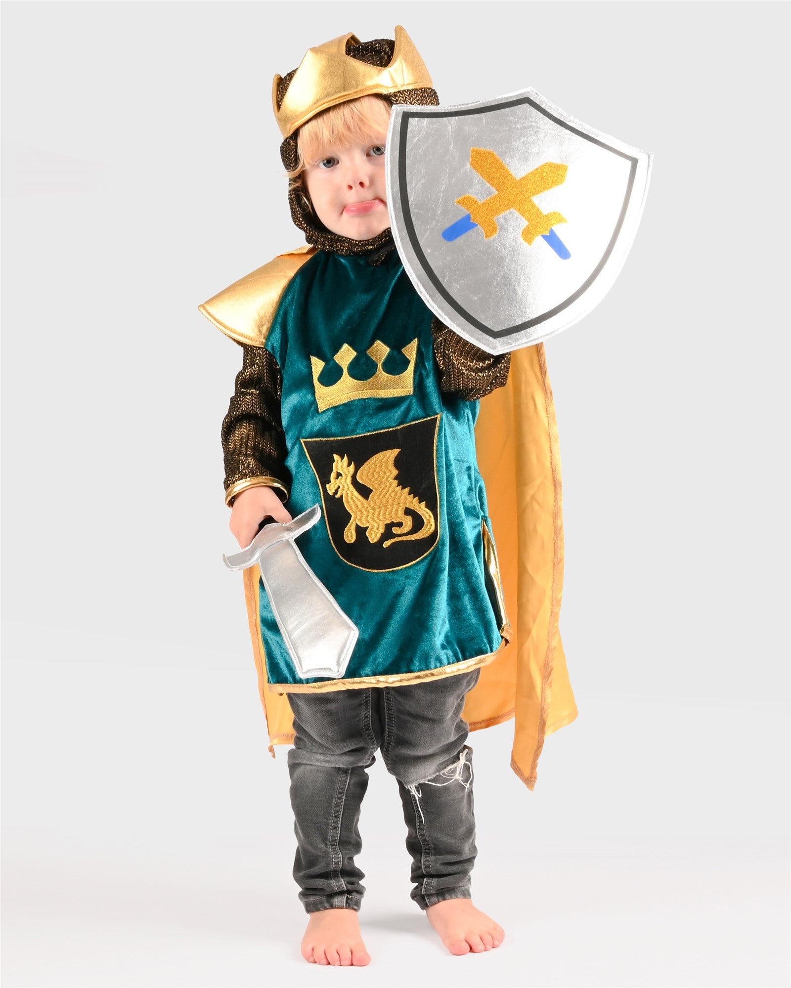 Prepárate para vivir grandes aventuras con el Disfraz de Caballero Turquesa de Den Goda Fen. Con un diseño elegante en terciopelo y detalles dorados, este conjunto es perfecto para juegos de rol, carnaval y fiestas temáticas.