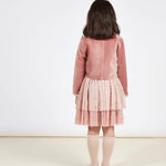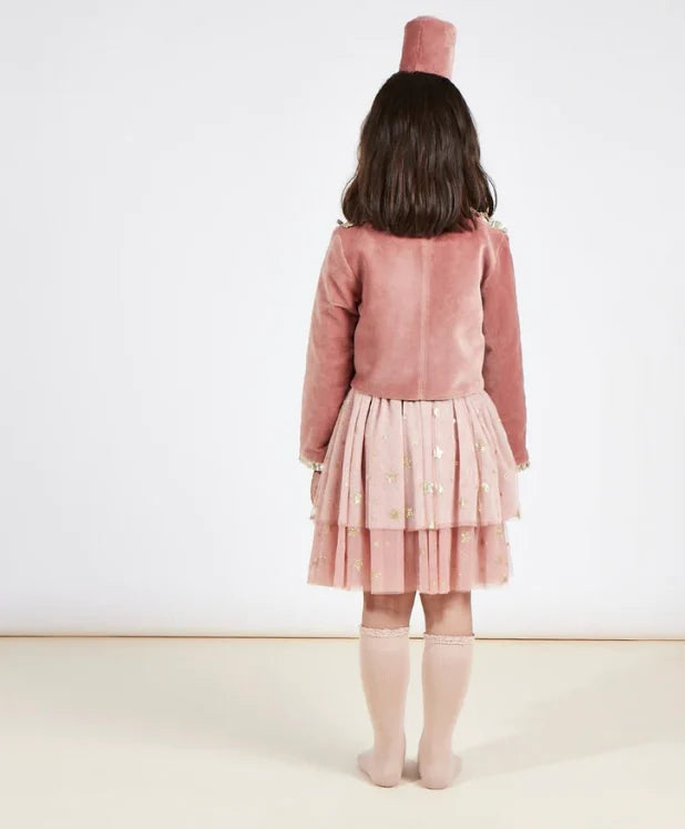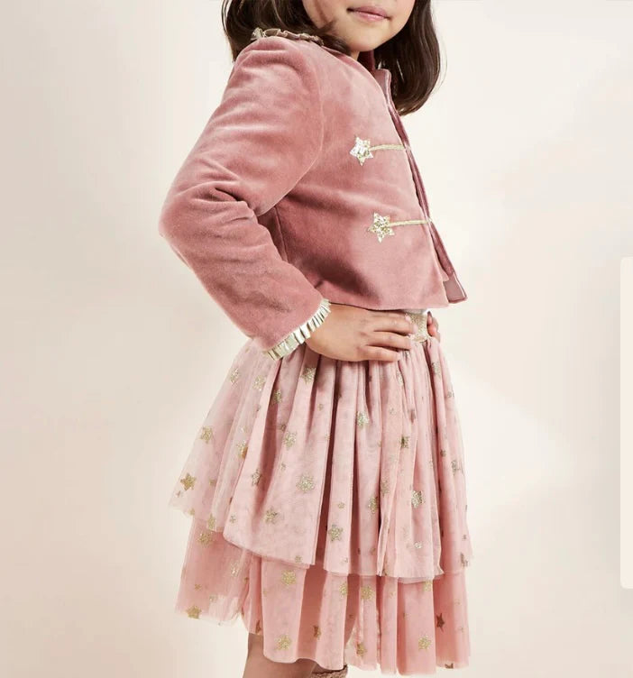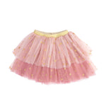 La falda tutú tiene varias capas de tul rosa, con una cintura elástica dorada y detalle de estrella de purpurina dorada. Esta falda también se puede combinar fácilmente con una camiseta y queda súper chic.