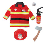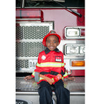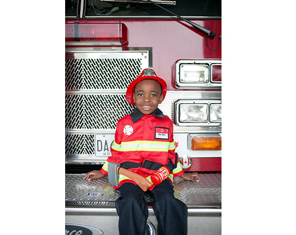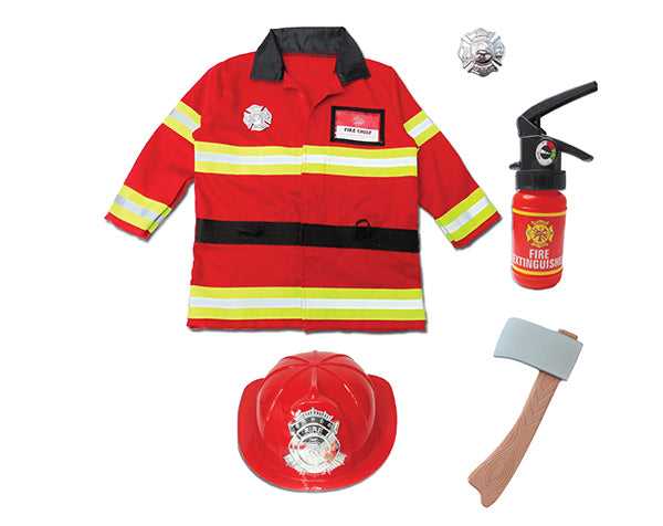 ¡Suena la alarma! Y vístete para luchar contra feroces incendios ficticios con este traje completo de bombero. Mire la pieza en este conjunto completo de 5 piezas para vestirse y jugar. El conjunto incluye un abrigo rojo con detalles de cintas reflectantes, un sombrero de bombero de plástico con un emblema, una placa con el nombre personalizada extraíble, un hacha de juego y un extintor de incendios (¡que en realidad es una pistola de agua!). El abrigo incluso viene con la insignia de plástico de la estación de bomberos a juego.