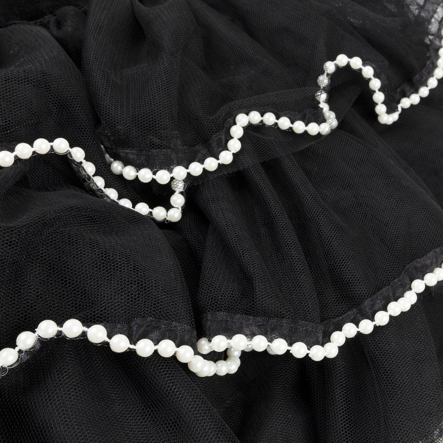 La falda está confeccionada con 3 capas de tul negro, con un forro de polialgodón y 3 capas de ribete de perlas artificiales blancas.