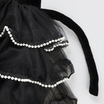 La diadema con lazo está cubierta de suave terciopelo negro y tiene un ribete de perlas artificiales blancas. Funciona como orejas de gato o como un accesorio divertido y elegante después de Halloween.