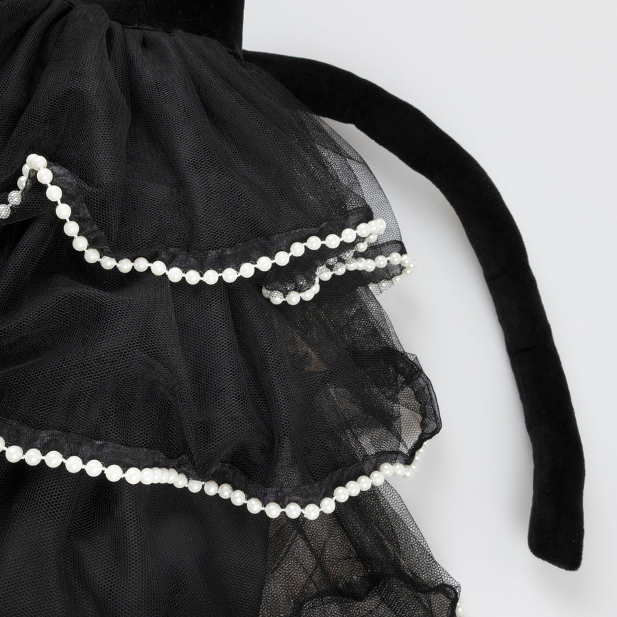 ¡Miau! ¡Hay un gato elegante al acecho! La atención al detalle de nuestros ingeniosos diseñadores hace que este disfraz de gato para Halloween sea increíblemente elegante. La falda de tul negro tiene perlas artificiales y una cola desmontable, así que podrás usarlo en fiestas de disfraces o en cualquier otra ocasión. La diadema de terciopelo negro, con un lazo llamativo y detalles de perlas artificiales, es igual de encantadora, y también funciona como orejas de gato para completar el elegante look felino.