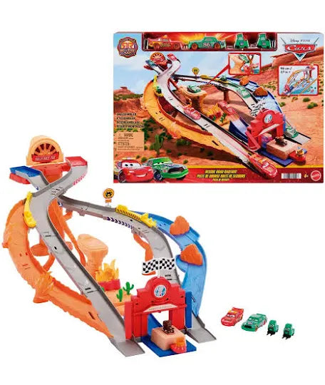Mattel Disney Pixar Cars Rescate a toda máquina en Radiador Springs Circuito de carreras de rescate Conjunto con Rayo McQueen y Chick Hicks con 2 vehículos del equipo de Pitties, 2 maneras de jugar