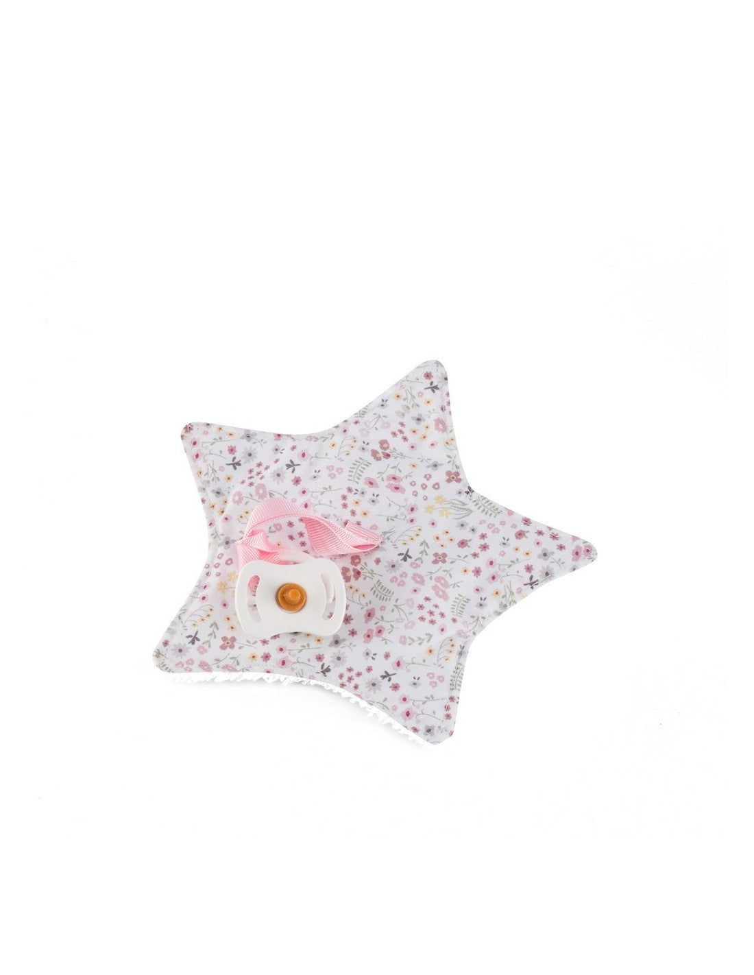 Doudou estrella flores y vichy Cloe ideal para que tu muñeca concilie el sueño ya que lleva incorporado el chupete.