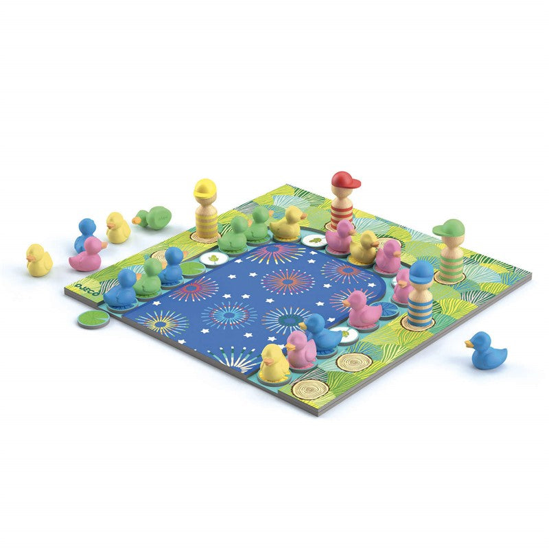 Contenido: 1 tablero, 21 fichas de nenúfar, 24 tarjetas de regalo, 16 patos de plástico, 4 fichas de madera. Reglas del juego en 10 idiomas.