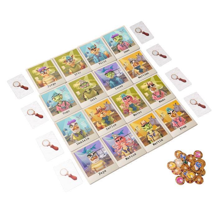 Contenido: 4 cuadernos, 4 lápices, 4 fichas de detective, 48 fichas de investigación, 32 cartas de pistas, 25 losetas de sospechosos, reglas de juego.