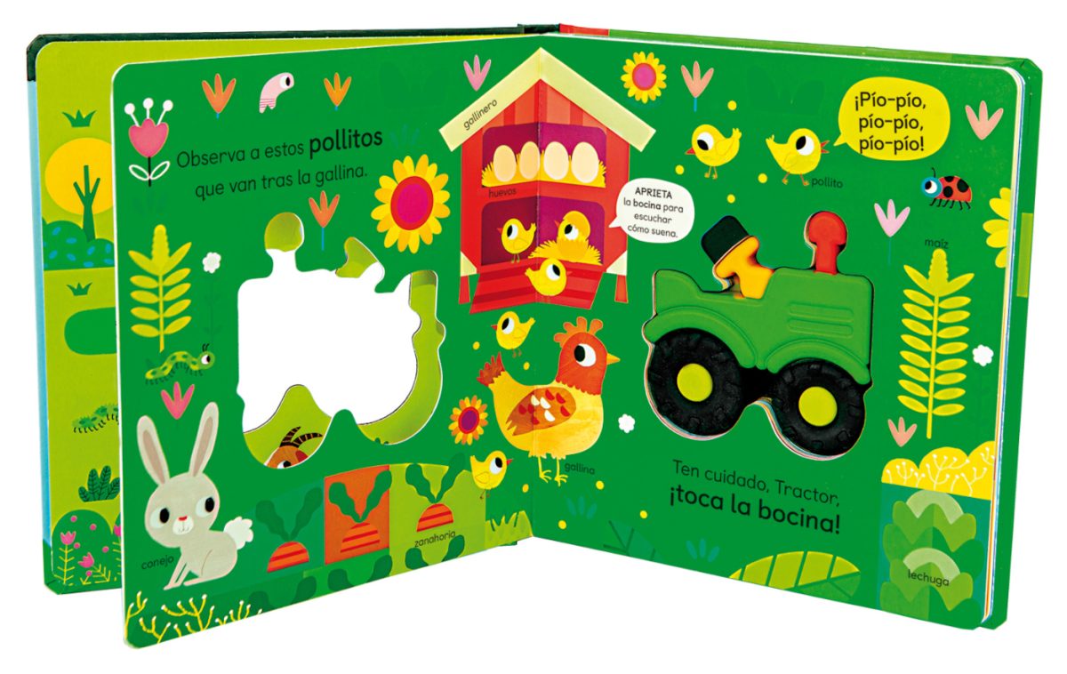 Un tractor con mecanismos sonoros recorre los alrededores de una granja donde encontrará a los pollitos y las gallinas, las ovejas, las vacas y los terneros. A los niños y las niñas les encantará apretar las partes blandas de este tractor para escuchar los sonidos de la