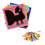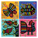 Una actividad manual de enhebrado con muchos hilos de felpilla. Siguiendo las instrucciones del cuadernillo, el niño introduce los hilos de felpilla por los orificios de las tarjetas. Cuando la tarjeta está llena, se convierte en un bonito cuadro de colores inspirado en el arte kuna de América del Sur.