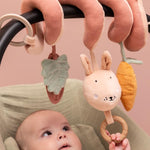 Este espiral de actividades da color al dia! Lo enrollas sin problema en cualquier silla de coche o paseo. Cada uno de los tres juguetes adjuntos tienen una función específica: un anillo de madera, papel arrugado , un espejo y una campanilla. Todos los elementos están atados con un anillo de juguete, lo que permite fácil soltura para que pueda seguir jugando sin atar.