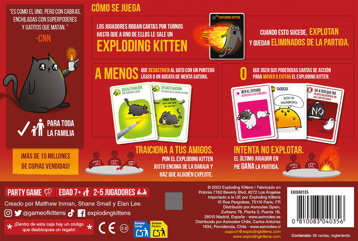 Exploding Kittens es un juego de mesa que combina la emoción de la ruleta rusa con un enfoque estratégico. Los participantes van robando cartas hasta que uno de ellos saca un Exploding Kitten, lo que provoca su eliminación de la partida, a menos que cuente con una carta de Desactivación.