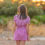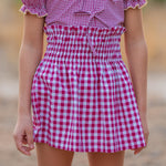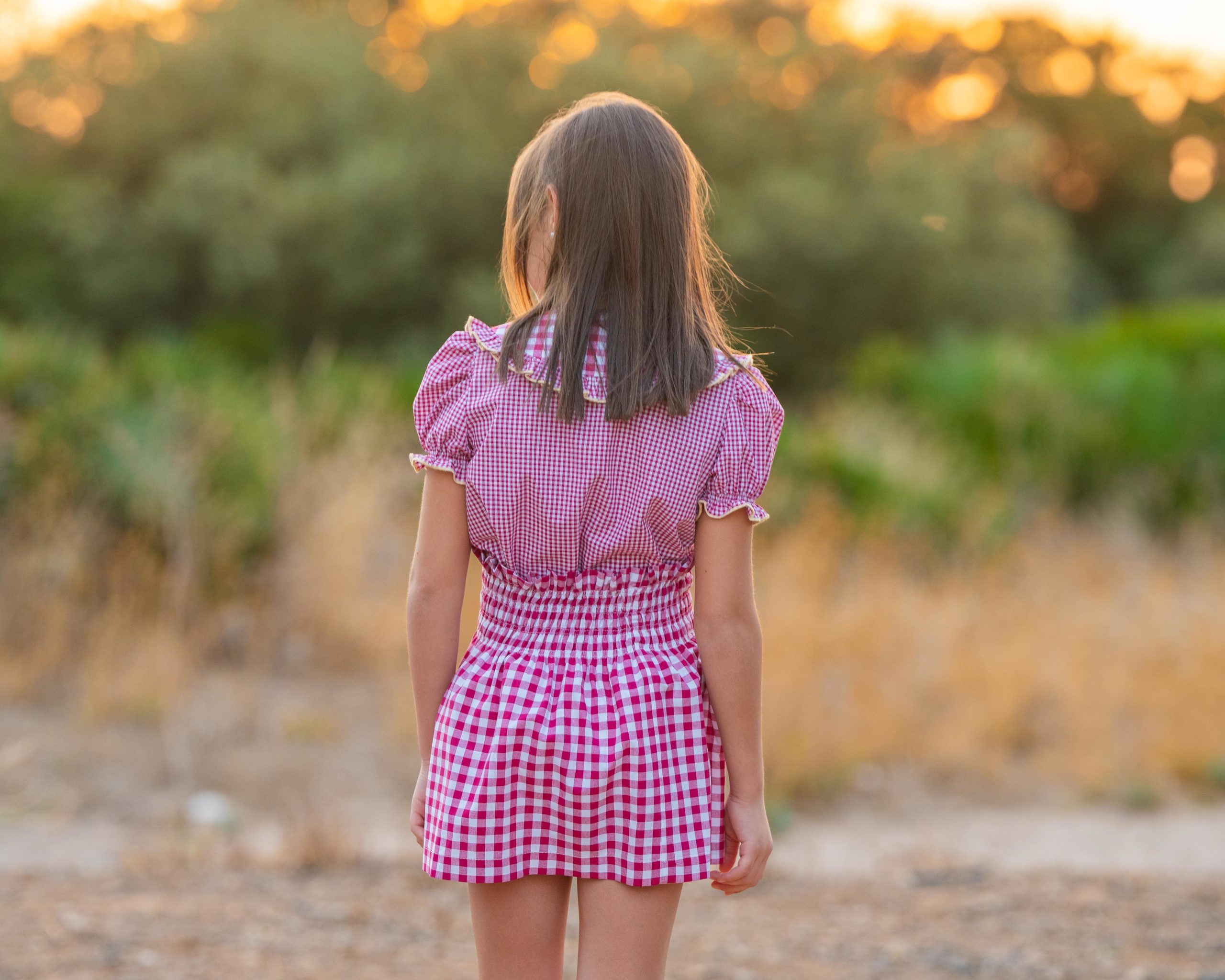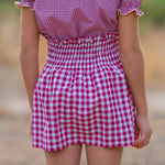 Falda súper favorecedora con cintura engomada en tejido cuadros Vichy frambuesa.