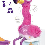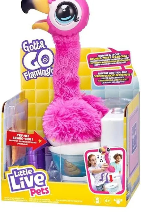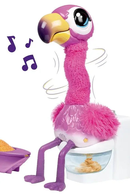 Gotta Go es el flamenco más divertido y moderno. ¡Te hará reír mientras mueve el cuello y repite lo que dices! Después de darle de comer, te hará saber cuando tiene que ir al baño con una canción muy divertida. Hace caquita en forma de arenilla de color neón. Luego, se saca la arena del W.C y al secarse puedes repetir el juego tantas veces como quieras.