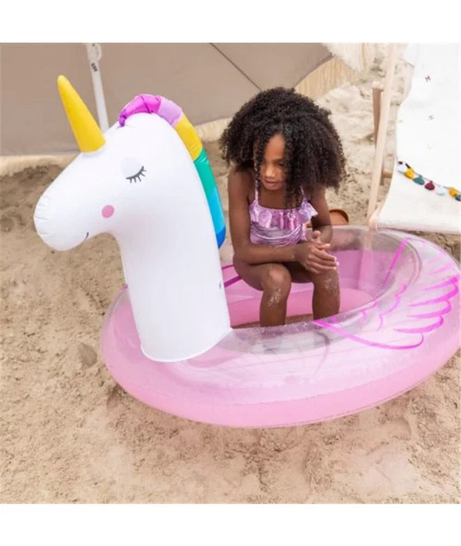 El flotador Swim Essentials Transparant Unicorn es adecuado a partir de 6 años. Soporta una carga máxima de 80 kg y tiene un diámetro de 104 cm, lo que lo hace más cómodo que otros flotadores. Es perfecto para relajarte y divertirte sobre el agua o la arena.