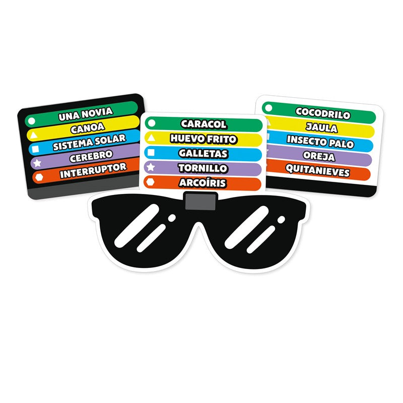 Contenido: 50 cartas con 500 categorías, ruleta, tablero, 5 tarjetas de dibujo, 5 rotuladores, hoja de puntuaciones, gafas de cartón, hoja de pegatinas, reglas del juego.