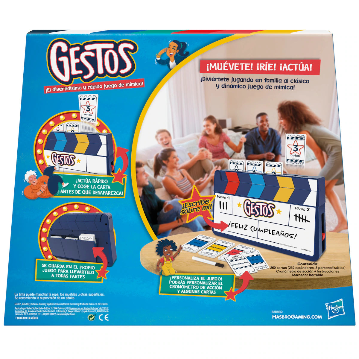 El juego de mesa Gestos de Hasbro es una opción para disfrutar en grupo, diseñado para un máximo de cuatro jugadores. Los participantes seleccionan cartas y realizan mímicas para que su equipo adivine las palabras o frases antes de que se acabe el tiempo. Incluye contenido de cartas nuevo y cartas personalizables, lo que añade creatividad y variedad a cada partida. La duración del juego es de más de 15 minutos.