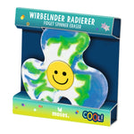 Goma de borrar con diseño de fidget spinner. Se sostiene con el pulgar y el índice en el centro para hacerla girar.