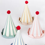 Estos adorables sombreros de fiesta a rayas son perfectos para los primeros años y baby showers. Inspirados en paletas de colores vintage, con pompones rojos y elástico rojo para un look actual. Un elegante borde festoneado le da un toque extra de estilo.
