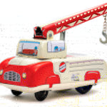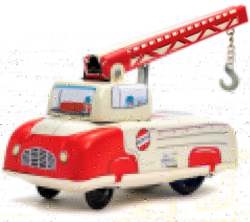 Pulse la grúa y el camión se alejará. Este camión de lata incluye un inteligente motor Press n Go escondido en la grúa.