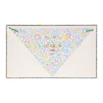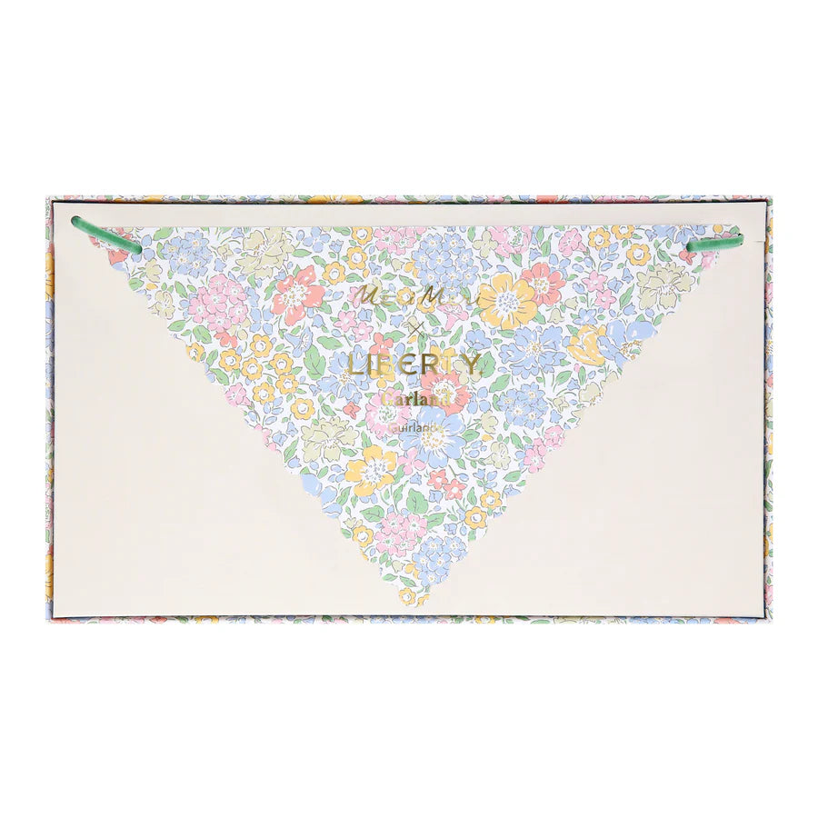 Los diseños florales de Liberty, tanto en la guirnalda como en la caja, combinan a la perfección con banderines con borde festoneado, lazos de terciopelo rosa y una cinta de terciopelo verde.