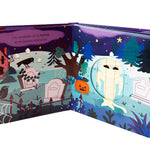 Halloween puede ser muy divertido…, si abrir este libro has elegido. Pasa las páginas para ver algunos personajes espantosos… ¡transformarse ante tus ojos! Un libro todo cartón con un mecanismo de ventanas que cambian para celebrar Halloween con el vampiro, la momia, un esqueleto, el hombre lobo y la bruja.