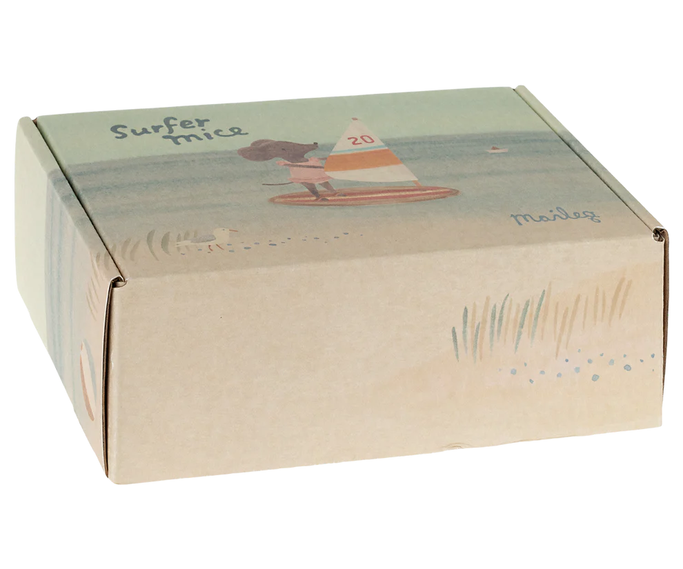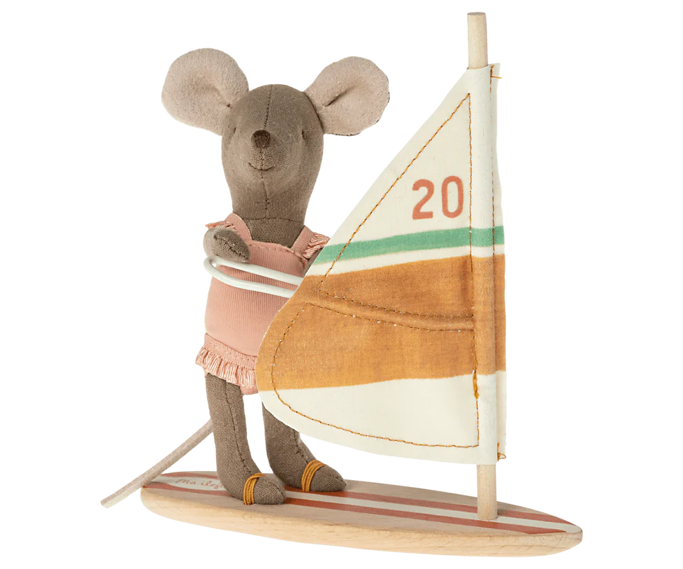 Tiempo de vacaciones. Este ratón está listo para un día de playa. Lleva traje de baño y trae su tabla de surf porque prefiere pasar el tiempo en el mar. La tabla de surf y el mástil son de madera.